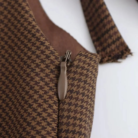 Vestido Curto Xadrez Marrom Botões Amarração Vintage