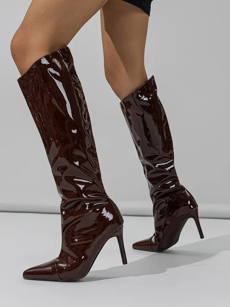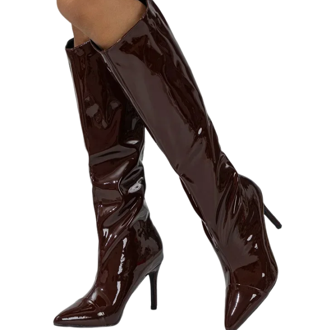 Eleve seu look ao máximo com a luxuosa Bota Catarina Cano Alto Vinho Verniz Salto Fino. Elegância e ousadia em um só calçado que vai transformar qualquer produção. Estoque extremamente limitado!