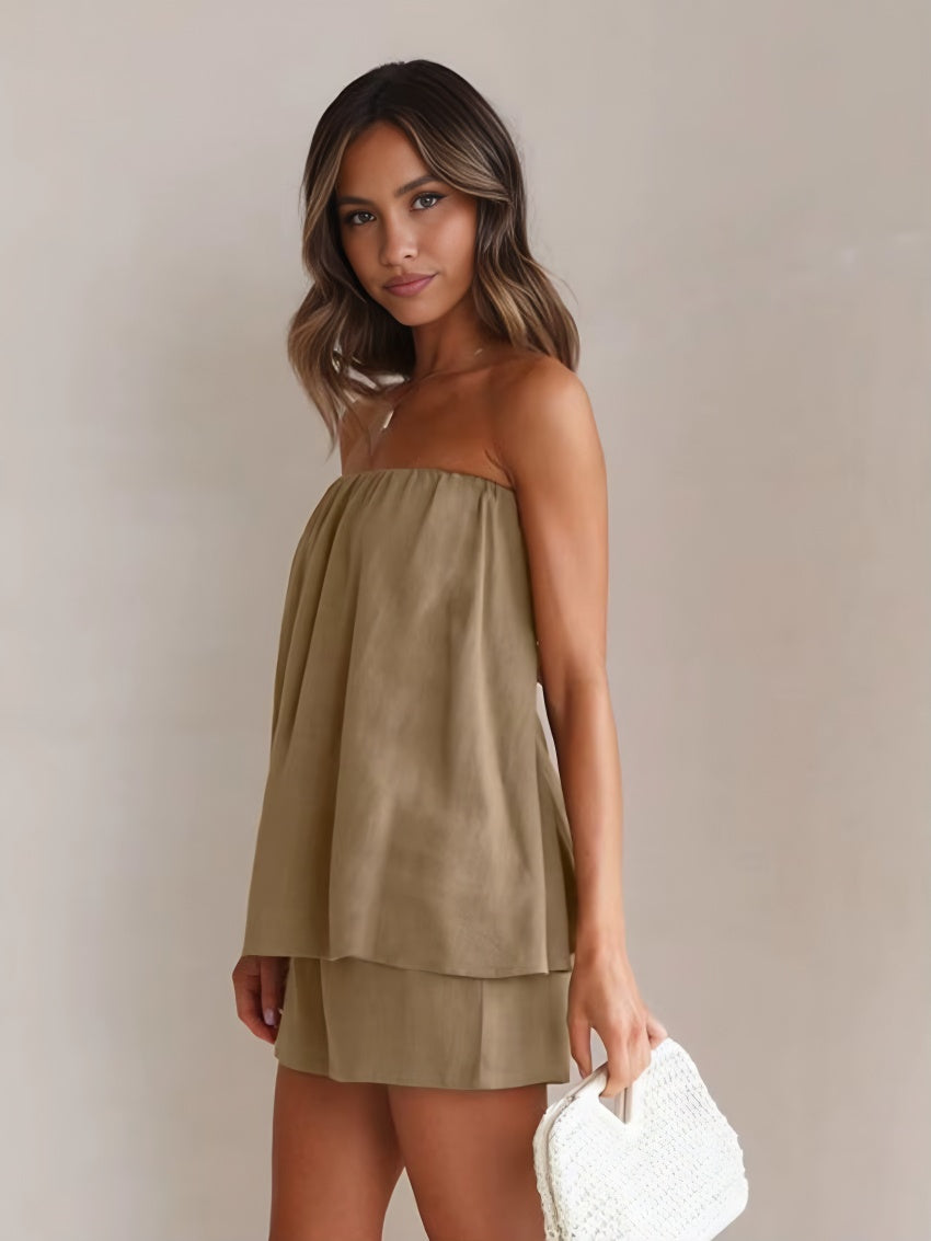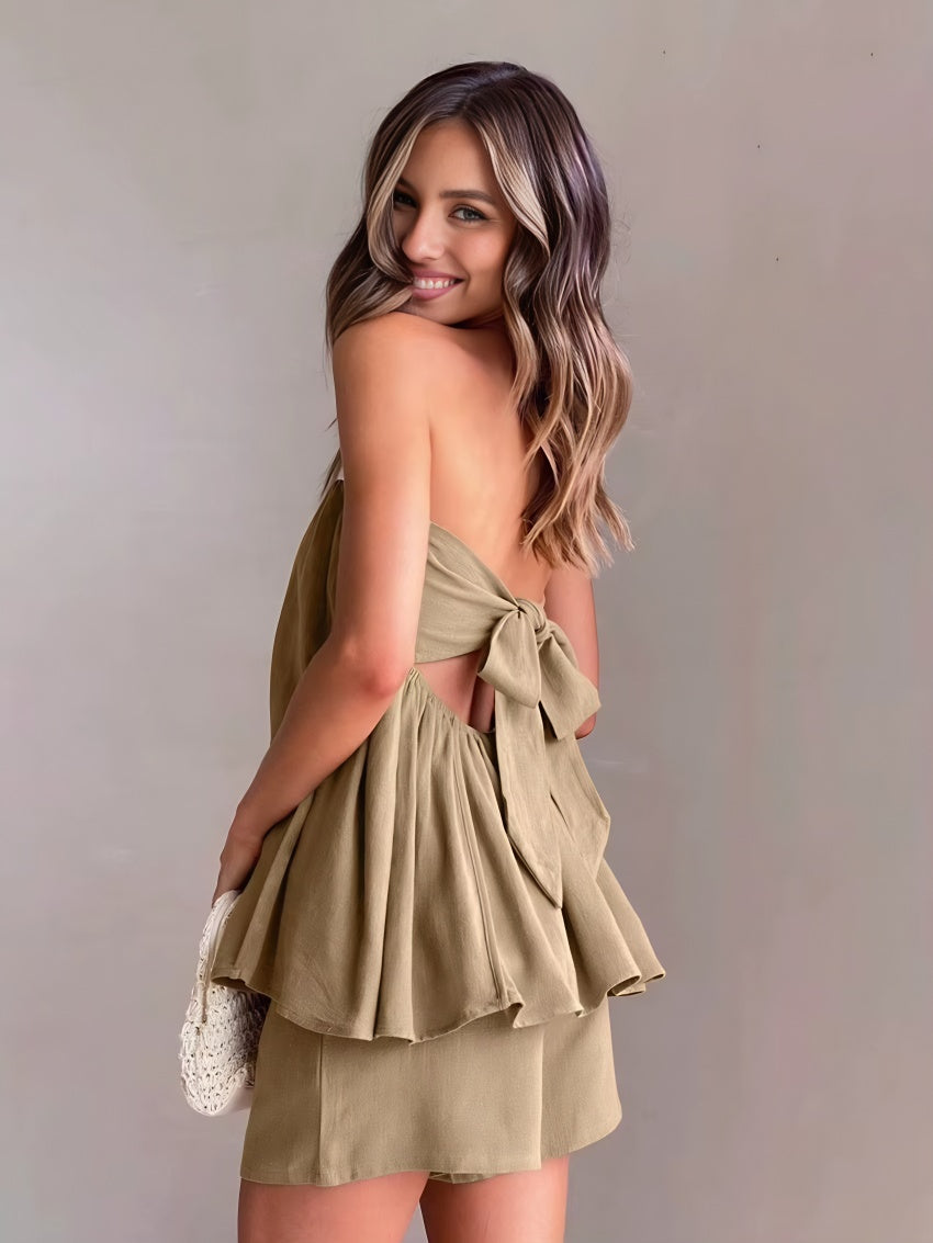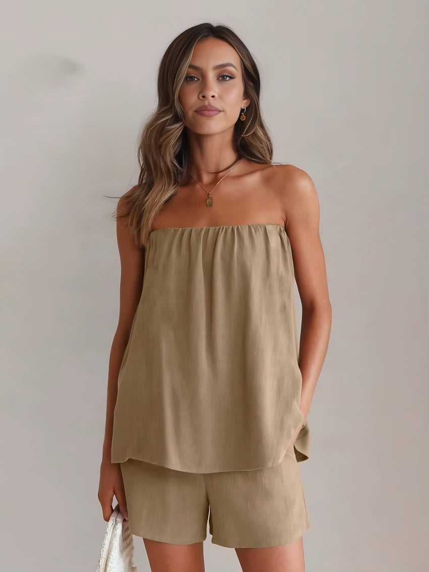 Uma explosão de sofisticação e estilo no seu closet, ele une o charme do tomara que caia com o toque macio do cotton mais confortável que você já sentiu. Em tom bege elegante, ele valoriza o look e destaca a pele em qualquer estação. Com a blusa de amarração nas costas, que proporciona um caimento perfeito, e o short de corte impecável, o Conjunto Maxine é a escolha que transforma o casual em extraordinário.
