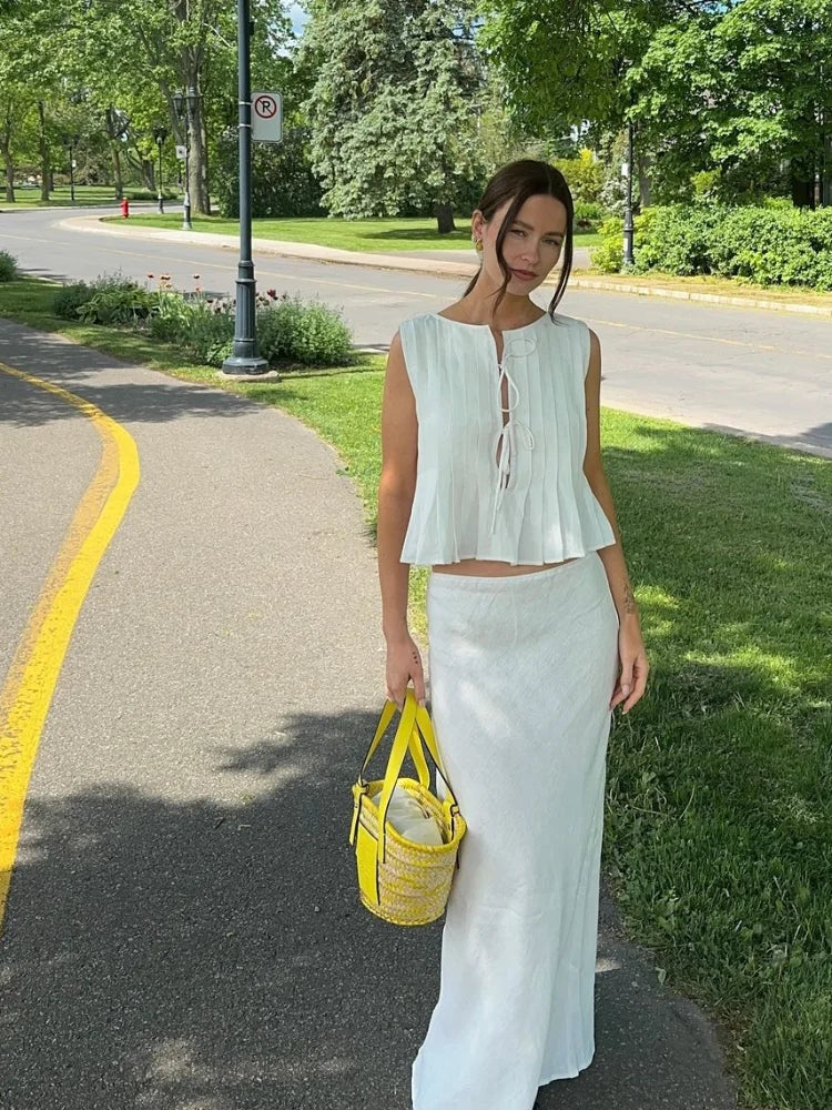 Deixe sua marca com o Conjunto Moretti! Este conjunto espetacular com top frente única plissado de amarração e saia longa é a escolha definitiva para o verão. Feito de tecido de algodão leve e confortável, ele não só exala frescor, mas também oferece um ajuste perfeito que destaca sua silhueta de forma irresistível. Não se contente com o ordinário – vista-se para impressionar e domine todos os olhares. Adquira o Conjunto Moretti agora e eleve seu estilo ao ápice da sofisticação e do charme!