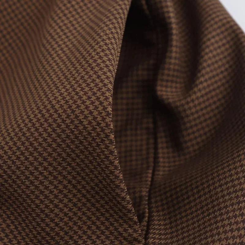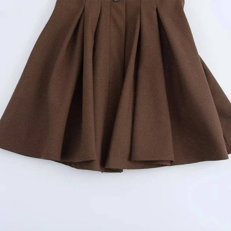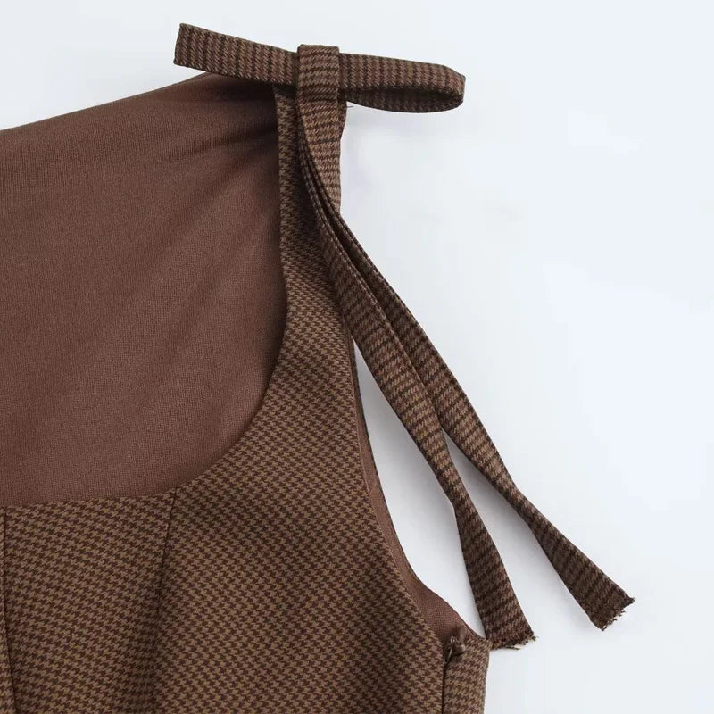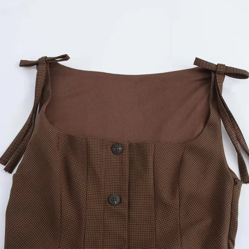 Vestido Curto Xadrez Marrom Botões Amarração Vintage