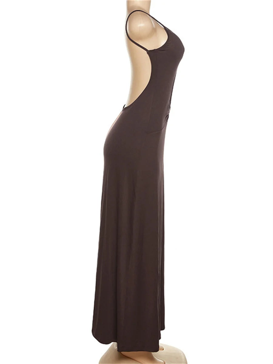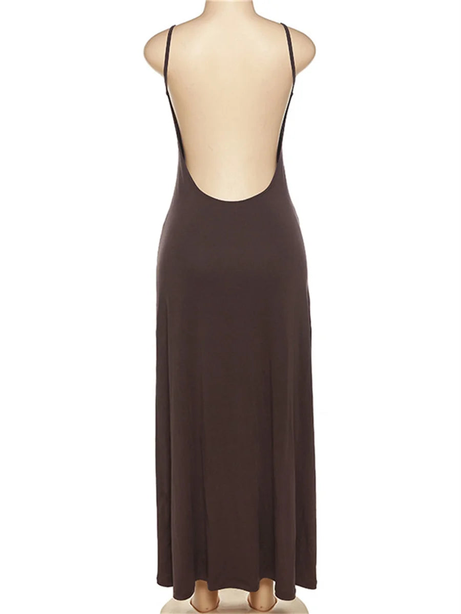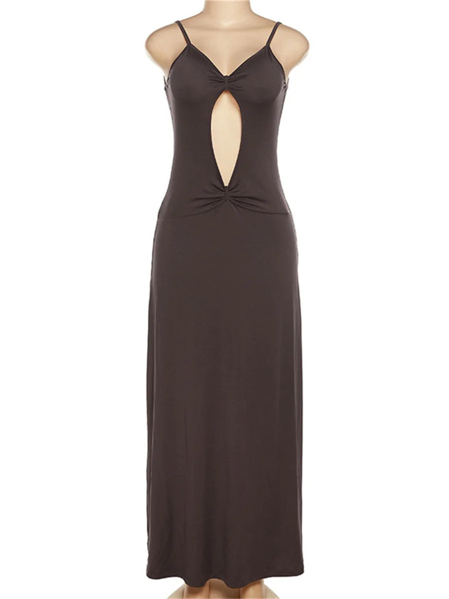 Vestido Longo Sexy Marrom Alcinha Vazado Frontal Decote nas Costas